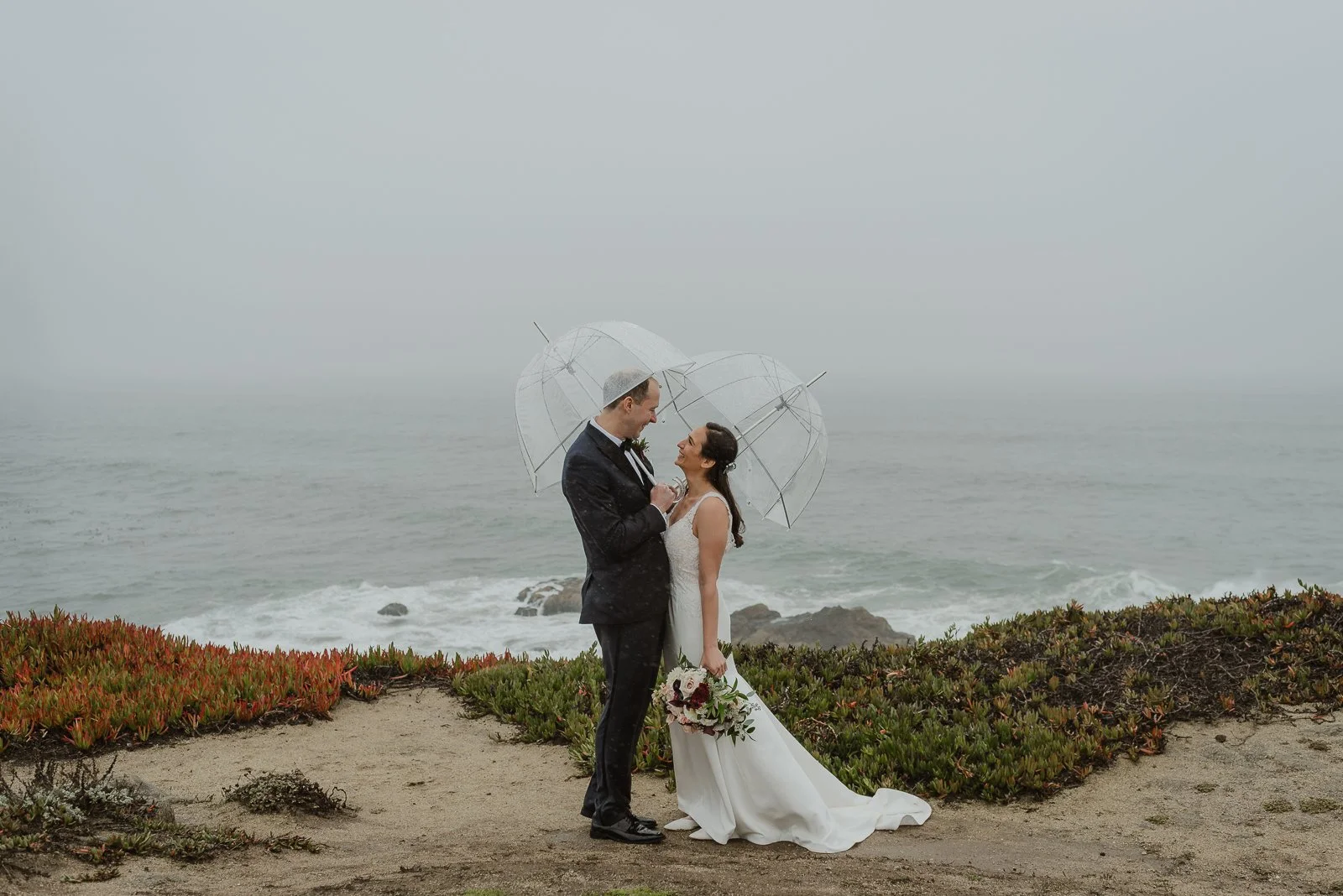If you're reading this, there's a good chance Viv sent you because it might rain on your wedding day! Our emotions eventually shifted from "what if it rains?" to "it's totally going to rain - what do we do?!" and I think moving to a mindset of acceptance a few days in advance helped us push aside disappointment and focus on having a fun time on our big day. We had an all outdoor venue, so we bought 10-packs of clear umbrellas and clear ponchos for all guests on Amazon as soon as we saw the 10-day forecast wasn't looking good. About two days before our wedding, it was very clear that we were up against a 100% chance of rain. Thankfully we had an email list for all of our guests handy, so we emailed them inviting them to bring jackets and umbrellas. This wasn't the formal attire we envisioned, but we hope it helped our guests stay dry and have a more enjoyable evening. I was also worried about bridal hair. I tend to have frizzy hair and worried that getting married near the ocean + outdoors + wind + rain meant I had too scrap my half-up/half-down hairstyle and go with some kind of unplanned updo. Ultimately, I decided not to change the plan. The weather didn't end up impacting my hair as much as I thought it would, and I'm glad I stuck to the plan I invisioned. We did pay a bit extra for the hair/makeup stylist to do some touch-ups after the ceremony, and I think that was the right call. I was pretty wet!